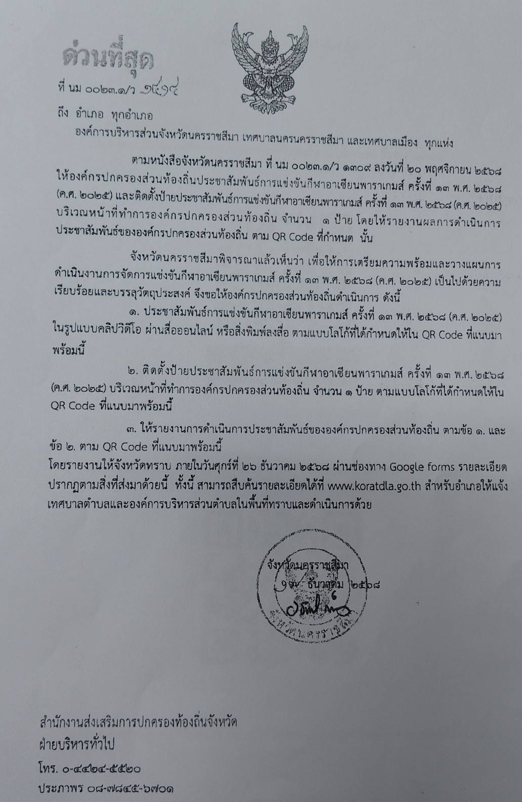 ตามที่ สำนักงานส่งเสริมการปกครอท้องถิ่นอำเภอเทพารักษ์ ได้แจ้งให้องค์กรปกครองส่วนท้องถิ่นประชาสัมพันธ์การแข่งขันกีฬาอาเซียนพาราเกมส์ ครั้งที่ 13 พ.ศ. 2568 (ค.ศ.2025) นั้น องค์การบริหารส่วนตำบลบึงปรือ จึงได้มีการประชาสัมพันธ์การเเข่งขันกีฬาอาเซียนพาราเกมส์ โดยการติดตั้งป้ายประชาสัมพันธ์บริเวณที่ทำการองค์การบริหารส่วนตำบลบึงปรือ และประชาสัมพันธ์ผ่านทางเว็บไซต์ขององค์การบริหารส่วนตำบลบึงปรือ