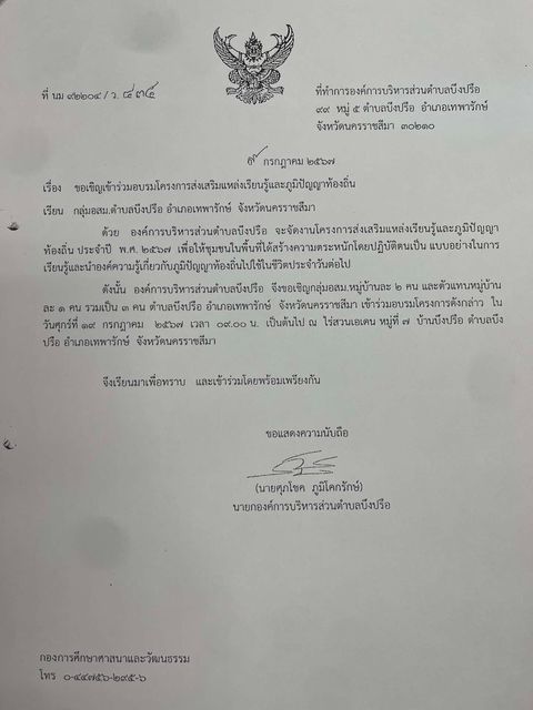 ขอเชิญเข้าร่วมอบรมโครงการส่งเสริมแหล่งเรียนและภูมิปัญญาท้องถิ่น (ประธาน อสม.ตำบลบึงปรือ)